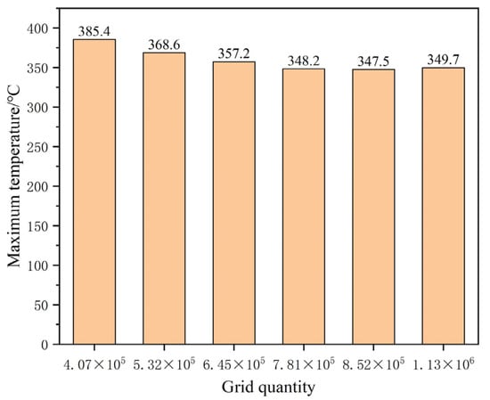 The appropriate grid quantity and partition method can not only reduce the computing resources effectively and improve the computing speed, but can also improve the accuracy of the calculation results. Therefore, it is necessary to verify the independence of different numbers of grids. The number of grids ranges from 400,000 to 1.2 million, and 6 kinds of grids were selected for calculation, and the highest temperature of thermocouple No. 3 was taken as the standard of measurement. The maximum temperature corresponding to the number of different grids is shown in Figure 4. When the number of grids is larger than 781,000, the temperature error difference is within 2 °C, which meets the error requirement. Therefore, 781,000 grids were selected in this study to complete the research. The specific grid division results are shown in Figure 5.