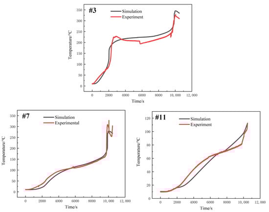 Comparison of experimental and simulation results of three thermocouples.