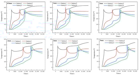 In order to analyze the influence of insulation thickness of different adjacent cells on heat transmission, TSAF-0525V organic fireproof coating used in our previous research was selected as the heat insulation material, with thermal conductivity of 0.21 W·m−1·K−1, specific heat of 1500 J·kg−1·K−1 and density of 1420 kg·m−3. Through comparative analysis of the insulation thickness of 0.5 mm, 1 mm, 2 mm, 3 mm, 4 mm and 5 mm, the temperature variation chart of each simulation is shown in Figure 8. It can be concluded from the results that, although increasing the thickness of the heat insulation layer cannot effectively prevent the thermal runaway propagation process, the insulation layer can separate the thermal runaway battery from the adjacent batteries, thereby inhibiting heat transfer between the batteries. The thicker the insulation layer is, the more obvious the inhibition effect is, and the longer the propagation time between the adjacent batteries.