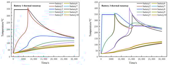 When thermal runaway occurred in three batteries in the battery module, namely in batteries 1, 2 and 5, thermal runaway did not occur in batteries 6 to 10. When thermal runaway occurred in batteries 1, 5 and 10, the thermal runaway speed of the modules would be significantly accelerated. At 16,814 s, thermal runaway happened in all batteries. This is shown in Figure 13.