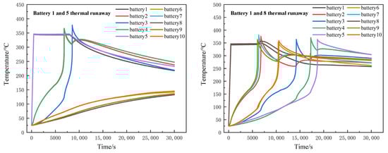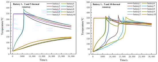 When two batteries in the battery module registered thermal runaway, namely batteries 1 and 5, it triggered the thermal runaway of batteries 2 and 4, and then caused thermal runaway of battery 3. Battery 3 reached the highest temperature of 398 °C at 8550 s, while batteries 6 to 10 in the y direction were affected by the thermal runaway of batteries 1 and 5 and registered temperature rise, but not as high as the triggering temperature. When thermal runaway occurred in batteries 1 and 8, thermal runaway would occur in all batteries, and finally in all batteries of the module. The whole process lasted 18,684 s. Batteries 6 and 10 thermal runaway occurred at 10,560 s. The propagation speed of thermal runaway occurring inside the module is faster than that on the edge of the battery module. The temperature change process is shown in Figure 12.