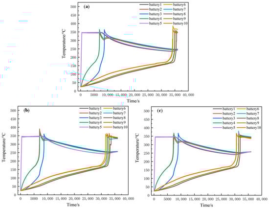 Figure 14 shows the temperature change in each battery when the thermal runaway of batteries 1 and 5 occurs at the same time and the spacing between the two columns of batteries in the module is 10 mm, 9 mm and 8 mm, respectively. When the spacing is 10 mm, the maximum temperature of batteries 6 and 10 reaches 385.6 °C and 366.1 °C, respectively, at 34,250 s after the thermal runaway of batteries 1 and 5. Batteries 7 and 9 reach the highest temperature at 35,020 s, while battery 8 experiences thermal runaway at 35,636 s. When the interval is 9 mm, the time when the thermal runaway reaches the maximum temperature of battery 10 is 31,566 s in advance. When the interval is 8 mm, the time when thermal runaway reaches the maximum temperature of battery 10 is 29,700 s. This indicates that the smaller the spacing between batteries is, the greater is the possibility of runaway thermal propagation between modules within modules. Therefore, appropriate spacing between battery modules can be designed according to the safety design requirements of energy storage power stations.