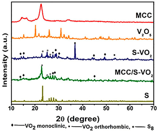 MCC/S-VO2 nanocomposite was prepared with weight ratios of 1:1.4 for V2O5/S and 1:1 for MCC/(V2O5+S), respectively. A total of 10.26 g of MCC powder was added into 50 mL of DDI water, stirred for 1 h, and left to stand overnight. Six grams of sulfur was added into 50 mL of DDI water containing a drop of diethanolamide (non-ionic surfactant) to ensure the homogenous distribution of sulfur, and the suspension was stirred for 1 h; then, 4.26 g of V2O5 was added and stirred for another hour. The MCC suspension was added to V2O5-S mixture and uniformly mixed by using a mechanical stirrer at 600 rpm for 1 h. The resultant mixture was sonicated for 1 h and stirred overnight at 400 rpm to maintain the distribution homogeneity of the components. Finally, the mixture at neutral pH was transferred into a Teflon-lined stainless-steel autoclave and maintained at 180 °C for 24 h. The obtained black product was separated and washed several times with DDI water and ethanol. The final product was dried under vacuum at 70 °C overnight and stored in a vacuum desiccator until use. For comparison, the same procedure was followed without MCC to prepare doped S-VO2 nanoparticles. Scheme 1 presents the steps of MCC/S-VO2 preparation.