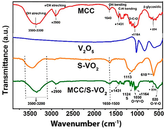 The FT-IR spectroscopy of the MCC, V2O5, S-VO2, and MCC/S-VO2 was carried out and is depicted in Figure 2. The MCC spectrum displayed a broad band at a region of 3300–3500 cm−1 and a weak band at 1640 cm−1, corresponding to the stretching and bending vibrations of OH groups, respectively [57]. The bands located at 2900 and 1431 cm−1 correspond to C-H stretching and bending vibrations, respectively. The band located at 1371 cm−1 is related to C-H asymmetrical deformations. In addition, the band observed at 1164 cm−1 is assigned to the C-O-C pyranose ring skeletal vibration, while the band located at 894 cm−1 is related to the β-glycosidic linkage vibration between the anhydroglucose units in cellulose [58]. The FT-IR spectrum of V2O5 exhibited three absorption bands at 1025, 832, and around 582–482 cm−1, which are in good agreement with the orthorhombic V2O5 [59]. The FT-IR spectra for S-VO2 and MCC/S-VO2 displayed a broad band in the region around 3200–3500 cm−1 and a sharp band in the region around 1500–1650 cm−1, due to the stretching and bending vibrations of OH groups, respectively, whereas the bands at 1124 cm−1 and 1113 cm−1 for S-VO2 and MCC/S-VO2, respectively, may be attributed to sulfur adsorbed to the VO2 surface [40]. The bands at 1030 and 1056 cm−1 for MCC/S-VO2 and S-VO2, respectively, are assigned to O=V=O stretching vibration [40]. The initial sharp vibrational band at 610 cm−1 for S-VO2 and 520 cm−1 for MCC/S-VO2 can be associated with the V–O–V octahedral bending modes of VO2 [60,61]. Additionally, the band at 710 cm−1 for MCC/S-VO2 is assigned to the coupled vibration of V=O [61]. The absence of V2O5 absorption bands indicated the formation of VO2 in the final product, whereas the bands at 2900, 1431, 1371, 1059, 1164, and 894 cm−1 indicated a homogenous distribution of S-VO2 between MCC microfibers.