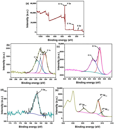 XPS broad spectrum (a), XPS spectra of C 1s (b), O 1s (c), S 2p (d), and V 2p (e) of MCC/S-VO2 nanocomposite.