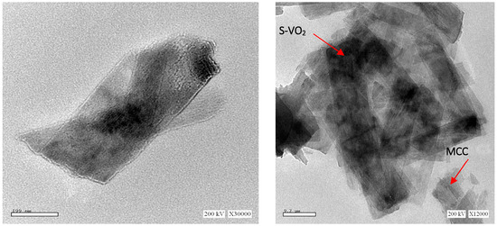 The morphology of the synthesized MCC, S-VO2, and MCC/S-VO2 products has been investigated utilizing an (FE-SEM), as shown in Figure 5a–c. The SEM micrograph of MCC, Figure 5a, reveals the nonuniform shape of micro-sized fibrils, which can be attributed to the degeneracy of fibrous strands to micro-sized crystallites during acid hydrolysis, which cleaved the amorphous part of the cellulose chain [58,69]. The FE-SEM image of the S-VO2, Figure 5b, displays the nanorod shape. Meanwhile, Figure 5c implies a homogenous combination of phases forming the MCC/S-VO2 composite. The elemental distribution in the MCC/S-VO2 nanostructure was clarified by EDX spectrum, Figure 5d. The spectrum confirms the purity of the prepared composite as well the presence of the vanadium and sulfur elements in the sample, whereas the other peaks are assigned to C and O, supporting the presence of MCC molecules in the as-prepared nanocomposite. Moreover, the microstructure of the MCC/S-VO2 nanocomposite was examined employing the HR-TEM technique, Figure 6. The HR-TEM image of the MCC/S-VO2 nanocomposite exhibited the irregular shapes of S-VO2 inorganic nanoparticles that were well-dispersed in the cellulose matrix. The sheet structure is due to the incorporation of MCC with the S-VO2 system under the applied experimental condition.