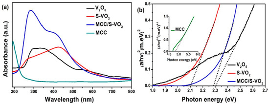 where α is the absorption coefficient, h is the Planck constant, A is a constant, ν is the frequency, Eg is the absorption band gap energy, and n is one or four for a direct and indirect band gap, respectively [74,75]. Plots of (αhν)2 versus hν are shown in Figure 8b. The band gaps of V2O5, S-VO2, and MCC/S-VO2 were estimated to be 2.3, 2.1, and 2.29 eV, respectively. These are consistent with the results shown in Figure 8a, while the MCC product showed an indirect band gap Eg of 4.85 eV. The addition of sulfur plays a key role in charge transfer between the VB and CB band [76], which results in reducing the band gap of VO2, compared with 4.8 eV, which is given elsewhere [77].