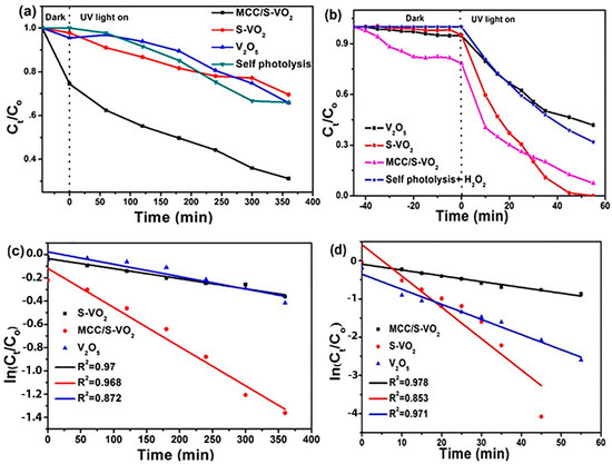 The photocatalytic performance of the as-prepared catalysts (S-VO2 and MCC/S-VO2), as well as V2O5, was evaluated by photodegradation of the MB solution in the presence and absence of H2O2 under the experimental conditions: 20 mg of photocatalyst and 100 mL of MB solution of 20 mg L−1 concentration. The degradation ratio (Ct/Co) with and without H2O2 is given in Figure 9a,b. Both V2O5 and S-VO2 manifested poor adsorption capacity and photodegradation percentage compared with those of MCC/S-VO2. The photocatalytic performance of the MCC/S-VO2 nanocomposite in the absence of H2O2 showed a photocatalytic efficiency of 72.3% within 360 min. The addition of 0.05 mL H2O2 (50% wt.) brought about a dramatic increase in the photodegradation of MB dye, which reached 92.5%, 100%, and 60.3% for MCC/S-VO2, S-VO2, and V2O5, respectively. In addition, the degradation time reduced from 360 min to 55 min, clarifying the significant role played by H2O2 in the photocatalytic process. The kinetic studies showed that the pseudo-first-order kinetic model was the best-fitting model that described the photocatalytic degradation of MB dye using S-VO2 or MCC/S-VO2 catalysts, regardless of the presence or absence of H2O2, as shown in Figure 9c,d. The kinetic parameters are given in Table 2. As seen in Table 2, the rate constant (kobs) values were greatly increased in a combined system (photocatalyst + H2O2).