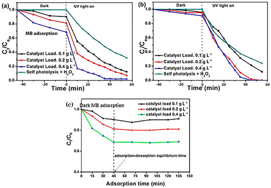 Effect of catalyst loading on the photocatalytic degradation of MB using MCC/S-VO2 (a) S-VO2 (b), dark adsorption curves for MB over MCC/S-VO2 (c).