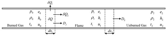 In the propagation process of a gas explosion, the explosion releases heat, and the temperature and enthalpy of the burned high-temperature combustion product increase, then turn into the energy of the explosion wave and kinetic energy of products by expansion [26]. Due to the temperature difference, the incandescent high-temperature combustion products dissipate heat to the wall by convection and thermal radiation and transmit heat to the unburned gas by thermal conduction, diffusion, and thermal radiation. The propagation of gas explosion in a pipe is usually assumed to be one-dimensional to derive its energy balance equation, as shown in Figure 1. The flame wavefront moves forward and releases heat in time . During this process, the pipe wall dissipates heat from convection and thermal radiation, and transfers heat to the unburned gas through thermal conduction, thermal radiation, and diffusion, and the shock wavefront moves forward in the same time. The energy balance equation can be obtained as follows: