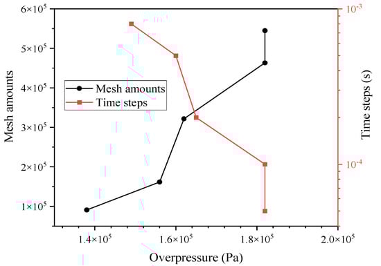 In order to ensure the accuracy of the numerical model, it is necessary to verify the mesh independence and time-step independence [28], as shown in Figure 3. The results of five numerical models (non-adiabatic model) with mesh numbers on the order of 9 × 104, 16 × 104, 32 × 104, 46 × 104, and 54 × 104 are compared. It is found that the results of 46 × 104 and 54 × 104 are very close, indicating that the mesh number in the order of 46 × 104 can meet the mesh independence and no densification is required, so the mesh number is set as 463,104, For the verification of time-step independence, it is found that the difference between the results of 1 × 10−4 s and 5 × 10−5 s is very small, so 1 × 10−4 s is selected as the time step size of the model.