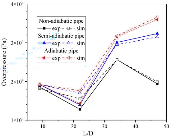 On the basis of independent verification, the numerical model is optimized, and the simulation results are compared with the experimental results, as shown in Figure 4. As can be seen, a good match can be obtained between the simulation results in this paper and the reported results in the experimental study, and the error mainly occurs at L/D = 22. The reason may be that the friction of the pipe wall in the experiment leads to a part of the energy dissipation of the gas explosion. In the numerical simulation, the pipe is ideally smooth, and this part of the energy dissipation is not calculated [29,30,31]. The error of the numerical model is very small, so it has enough reliability to carry out this study.