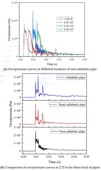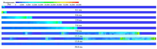 Figure 5 and Figure 6 show the overpressure variation during the propagation of gas explosion in pipes. As shown in Figure 5, the intensity of the gas explosion is weak, and the propagation speed is slow in the initial phase of the explosion. With the subsequent chemical reaction, the intensity of the explosion increases continuously, and the propagation of the high-pressure wave front continues to accelerate. At about 13.8 ms, the explosion wave reaches the open end of the pipe, and the explosion reaction process is basically finished. Then the explosion wave and flame spread into the air, and the pressure in the pipe continues to drop until it reaches the atmospheric pressure. Figure 6a is a detailed comparison of the overpressure variation at different locations of the pipe. With the distance increase from the initiation point, the arrival time of the explosion wave is delayed, and the maximum overpressure shows a decreasing-increasing-decreasing pattern, which is consistent with the experimental results in reference. In Figure 6b, the maximum overpressure of the explosion wave increases obviously with the decrease in the wall heat effect, and the maximum overpressure of the gas explosion increases by 15.2% and 24.2% with the decrease in the wall heat effect. The wall heat effect at the initiation section of the pipe has the most obvious effect on the intensity of the gas explosion, and reducing the wall heat effect at the latter half of the pipe can also increase the intensity of the gas explosion. As can be seen from Figure 6, there are much clutter and vibration, which may be caused by wall shock wave reflection.