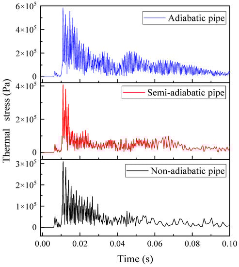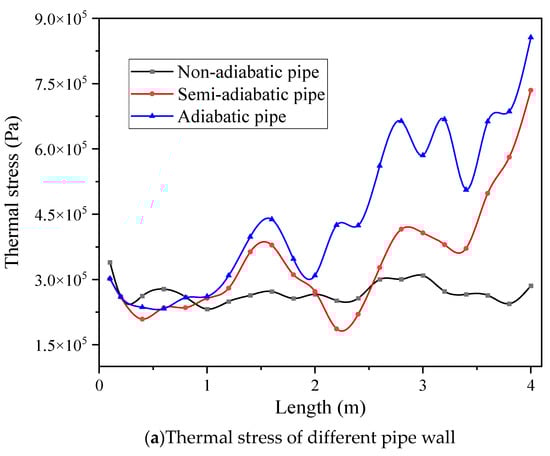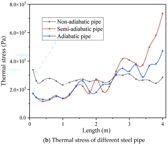 It can be found from Figure 8b that the thermal stress of the semi-adiabatic steel pipe and the adiabatic steel pipe at a 2 m distance of the initial section is similar and is smaller than that of the non-adiabatic steel pipe, which mainly occurs the thermal stress has been significantly weakened when it passes through the adiabatic layer. In the latter 2 m, the thermal stress of semi-adiabatic steel pipe and adiabatic steel pipe exceeds that of non-adiabatic steel pipe. Due to the incomplete adiabatic layer, the maximum thermal stress of semi-adiabatic steel pipe is greater than that of adiabatic steel pipe. It indicates that the adiabatic layer enhances the explosion process more significantly. Therefore, the thermal stress of the second half of the pipe increases along the axis, and finally, the value is greater than that of the non-adiabatic pipe.