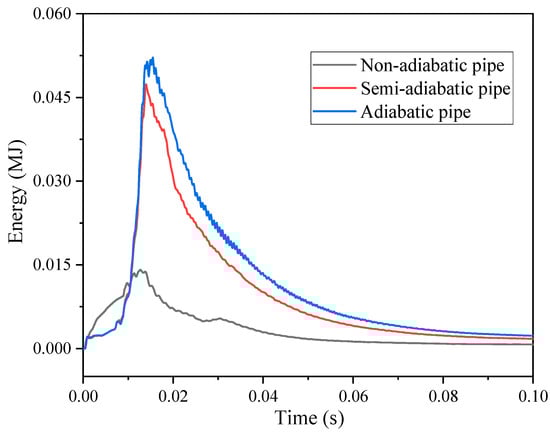 The reaction process of a gas explosion releases a lot of heat and forms a high-pressure shock wave, and the high temperature and high pressure simultaneously act on the wall, resulting in huge thermal stress on the wall. The thermal stress can correspondingly reflect the intensity of the gas explosion and the energy change of the wall. Figure 7, Figure 8 and Figure 9 show the changes in thermal stress and energy of the three pipe walls under a gas explosion. As shown in Figure 7, with the progress of the gas explosion, a large thermal stress appears on the wall under the impact of high temperature and high pressure. With the decrease in adiabatic degree, the wall heat effect increases, the heat dissipation capacity of the wall increases, the wall thermal stress decreases obviously, and the high-stress duration shortens. Compared with the adiabatic pipe, the thermal stress of the non-adiabatic pipe wall is reduced by 47.2%, and the duration is reduced by nearly half, indicating that the increase in the wall heat effect significantly weakens the gas explosion intensity.