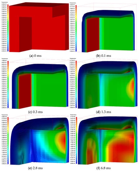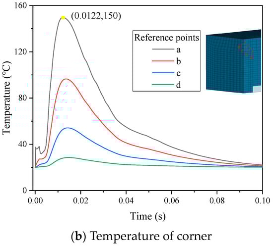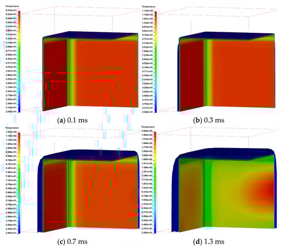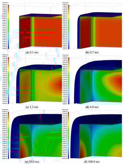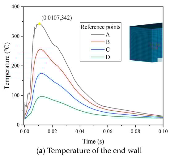 The gas explosion in the pipe is a very rapid heat release process, which causes the gas temperature in the pipe to rise rapidly, and forms a huge temperature difference inside and outside the pipe. Part of the heat in the pipe will spontaneously transfer outward the pipe wall along the thickness direction, forming a certain temperature gradient distribution. Figure 10, Figure 11 and Figure 12 show the temperature distribution of different pipe walls under the wall heat effect. To make the display more intuitive and clearer, the wall near the closed end is intercepted for demonstration. It can be seen from Figure 10 that the temperature of the pipe wall increases significantly at 0.1 ms, a certain temperature gradient is formed along the thickness direction, and the temperature of the closed-end wall is higher than that of the side wall or the corner. Combined with Figure 5, it can be seen that the gas explosion has not yet spread to the closed end at this time, and the temperature rise of the wall is mainly caused by the heat radiated by the high-temperature gas in the combustion zone. Then the shock wave reaches the end of the pipe, thermal convection transfers heat from the explosion wave to the inner surface of the pipe wall, and the temperature of the pipe increases continuously. At this time, the wall temperature is determined by the thermal convection on the inner surface of the wall, the radiant heat in the combustion area, and the thermal conduction from the combusted area. The highest temperature area is transferred from the end wall to the side wall. At 1.3 ms, the temperature gradient of the pipe contacts the outer surface of the wall, and the pipe begins to dissipate heat. With the continuous action of a gas explosion, the temperature of the pipe wall rises continuously, and reaches a maximum temperature of 496 °C at 2.8 ms, then rises gradually after a small drop and reaches the second temperature peak at 10.3 ms, after which the temperature drops continuously. These are consistent with the development law of gas explosion intensity described in Figure 4, Figure 5 and Figure 6.
