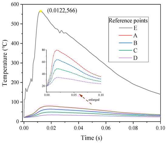 As can be seen from Figure 14 and Figure 15, there is a large temperature difference between the inner and outer surfaces of the asbestos layer. The temperature of the inner surface of the steel pipe is reduced to about 80 °C in the adiabatic pipe, which shows that the decrease in the wall heat effect can reduce the energy loss caused by heat dissipation of the wall. With the decrease in the wall heat effect, the temperature ratio of inner and outer walls expands from 3.54 times to 16.24 times and 16.55 times, and the peak value of pipe temperature rises from 342 °C to 549 °C and 566 °C, which shows that wall heat effect has an important influence on the gas explosion. By comparing Figure 13, Figure 14 and Figure 15, the higher the adiabatic degree of the pipe, the higher the maximum temperature of the wall, and the later the occurrence time. In summary, the decrease in the wall heat effect reduces the heat loss of gas explosion, and the heat is used to heat and compress the unburned gas, resulting in a more violent explosive reaction and a substantial increase in the temperature of the explosion gas.