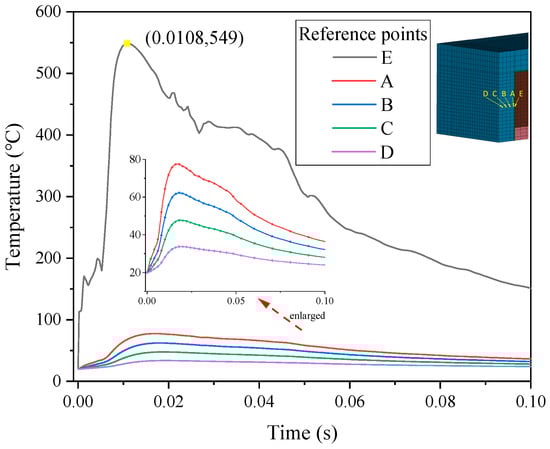 Several measuring points are taken along the wall thickness direction at the pipe to observe the specific change in wall temperature, as shown in Figure 13 and Figure 14. The temperature of pipes with different adiabatic degrees or different positions decreases rapidly after reaching a peak, and the temperature decreases gradually along the inner surface to the outer surface. The occurrence time of the maximum temperature is close to the time when the explosion wave burst out of the open end of the pipe, which indicates that the main reason for the rapid decline of temperature is that the explosion wave propagates out of the pipe, and the high-temperature gas is ejected from the open end to the outside environment, and the heat is quickly dissipated. The temperature change of the semi-adiabatic pipe wall fluctuates as the incomplete adiabatic layer, but the temperature change of the non-adiabatic pipe and the adiabatic pipe is relatively smooth. As can be seen from Figure 13, the maximum temperature at the closed end of the non-adiabatic pipe is doubled from the temperature at the corner, and the maximum temperature at the closed end appears earlier. Along the thickness direction, the temperature difference is larger when closer to the outer surface. It is shown that the wall heat effect is more obvious at the end wall, and there is an important correlation between the wall heat effect and the contact area of the combustion gas-wall surface. The large contact area between the combustion gas and the wall surface is more prone to convection heat transfer and sustains more thermal radiation.