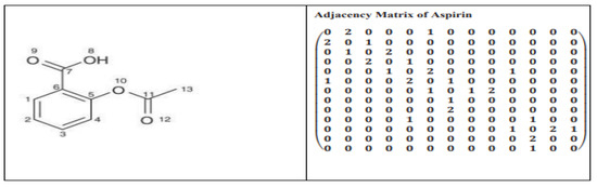 The adjacency matrix (AM) is among the first methods introduced for molecular representation. The AM is a square matrix with dimensions equal to the number of atoms in the specific molecule [24,25]. Figure 3 shows the AM representation of Aspirin. The dimensions of the AM are presented as (13 × 13), which means that the Aspirin molecule contains 13 atoms and each value in each AM Rowi represents the level of bond connection between Atomi with all molecule atoms.