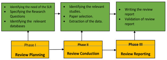 This section outlines the process of the proposed review approach, which is strictly based on the guiding principle provided by [23]. It entails the clearly defined stages to evaluate and analyze the selected articles to find any gaps in the body of knowledge and to review their contributions to the research questions (RQs) in order to reach a conclusion. Three steps make up the SLR process: review planning, review execution, and review documentation. Figure 4 depicts the various elements of each step as well as the results of each phase. The next subsection describes each stage.