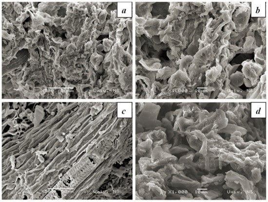 In order to observe the samples surface morphology SEM-EDX analyses have been performed (Figure 1). As can be seen the BR sample has a layered fibrous morphology with noticeable gaps between fibers and pores inside them. Since the AP consist of different types of materials like skin, flesh and apple seeds, the sample structure is not consistent and the micrographs vary depending on fruit part that is shown. Micrographs presented at Figure 1a,b shows apple flash which is more porous than skin and seeds, due to hemicellulose structure [33]. Surfaces, like these, with a larger contact area and more binding sites for ions, are more accessible to metal ions.