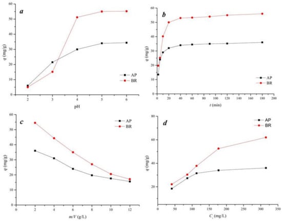 From Figure 3a it is evident that the sorption capacity (q) increases with increasing pH up to 5.0. Apparently BR has considerably higher sorption capacity in comparison to AP. Both biosorbents have higher affinity toward Pb2+ at higher pH values due to protonation of surface functional groups at lower pH values. It is well known that metal ions compete with hydrogen ions. At higher pH value of solution, surface deprotonation occurs causing better accessibility to positively charged lead ions, which often results in higher sorption capacity of sorbent [34]. Later in the text zeta potential analysis also revealed that both sorbents are negatively charged (at pH 5.0 values of zeta potential are −36.8 and −40.1 mV for AP and BR, respectively). All this implies the presence of negatively charged functional groups on sorbents surface, indicating that materials with such surface charges are capable of attracting positively charged metal cations [35]. Since, the maximum sorption capacity of both sorbents took place at pH value 5.0 all further experiments were performed at initial pH value of 5.0.