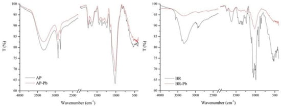 ATR-FTIR spectra of AP and BR before and after sorption of lead ions.