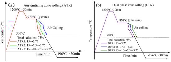 The experimental routes are shown in Figure 1 and Table 2. The initial rolling temperatures were set at the austenitizing zone and the γ + α dual phases zone. We discuss two different strategies for hot-rolled process: austenitizing zone rolling and dual phases zone rolling. During austenite zone rolling, the microstructure of UHSS is austenitic, while during two-phase zone rolling, it is austenitic + ferritic, resulting in a different rolled microstructure. Due to supercooling phase transition, strain-induced ferritic transition, and compositional segregation, a small amount of ferrite will be generated during the high-temperature zone of austenite. This leads to rolling in the two-phase zone, ultimately causing a decrease in the material’s strength and an increase in its toughness, as well as changes in the ratio of yield strength to tensile strength. Finally, the material’s final comprehensive performance is related to factors such as fine grain strengthening, the composition of various microstructures, and crystal orientation, which compete with each other. Therefore, in hot rolling and compression research, it is necessary to study two different rolling strategies: austenite zone rolling and two-phase zone rolling. So, the start rolling temperatures were set as 970 °C (γ, austenitizing zone) and 870 °C (γ + α, dual phases zone), respectively, and the finish rolling temperature fluctuated between 550 °C and 650 °C, measured using the infrared emissivity of 0.95 with a non-contact infrared thermometer of Delixi electric. The steels were first rolled from 15 mm to 3.75 mm at a reduction of 75% with multi-pass rolling in the γ and (γ + α) zone, respectively, then DCT in a cryostat for 30 min when the surface temperature declined to 500 °C, and naturally returned to the room temperature eventually. The DCT after the γ zone rolling and (γ + α) zone rolling was marked as ATR and DPR, respectively.
