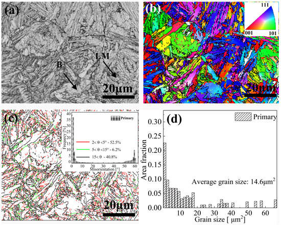 Figure 2a presents the microstructure of the original steel, which mainly consists of lath martensite (LM) and bainite (B). Figure 2b shows that crystal orientation is dominantly focused on [111], with less orientation towards [001]. Figure 2c,d reveals that the steel comprises a large proportion at 59.2% of low angle grain boundaries (LABs), with GB values ranging from 2° to 15°. This is due to the generation of low ratio recrystallization grains during the rolling deformation process. The average grain size is 14.6 μm2, with most of the grains having a diameter below 20 μm2, and a relatively low proportion of grains above 22 μm2. Table 3 lists the mechanical properties of the original steel, including its tensile strength (TS), yield strength (YS), Vickers hardness (VH), and total elongation (TEL), which are 1743 MPa, 1385 MPa, 300 HV, and 13.8%, respectively.