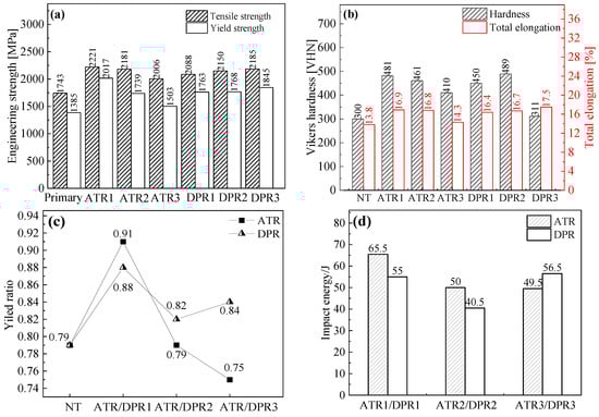 Mechanical properties. (a) tensile strength and yield strength, (b) hardness and total elongation, (c) yield ratio, (d) Charpy impact absorption energy at room temperature.
