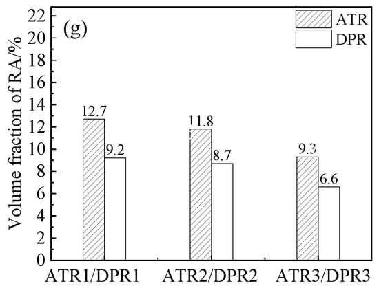 The SEM images under corresponding parameters. (a) ATR1, (b) DPR1, (c) ATR2, (d) DPR2, (e) ATR3, (f) DPR3, (g) the volume fraction of retained austenite.