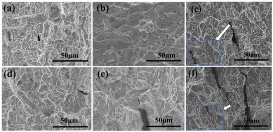 The fracture morphology indicates that the treated steel underwent ductile fracture, as evidenced by the numerous tearing dimples present, along with the snake slip located on the inner wall of the dimples. Furthermore, the size of the dimples in ATR was larger than in DPR. Additionally, no significant cracks were observed under ATR during the increase of rolling pass, whereas the length of the crack expanded with the increase of rolling pass under DPR. The cracks observed in both ATR and DPR were transcrystalline and intercrystalline, as shown in the enlarged image (blue dotted circle) in Figure 5c,d. Thus, it can be inferred that ATR can more effectively promote the enhancement of toughness than DPR.