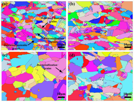 However, the size of child grains is influenced by the size of prior austenite grains. This section analyzed the evolution of prior austenite grains by reconstructing EBSD data. As shown in Figure 6, the reconstructed prior austenite grains for ATR1, ATR3, DPR1, and DPR3 are presented. Under ATR1, many fine prior austenite grains were observed, with more fine grains nucleated from prior austenite grain boundaries (PAGs). The PAGs were divided into even finer grains. On the other hand, under ATR3, the nucleation of PAGs weakened significantly with an increase in rolling pass, and the average size of PAGs in ATR3 was smaller than in ATR1. In contrast to the PAGs of ATR, there was no obvious recrystallization in DPR. Most of the PAGs were deformed grains, and some PAGs were divided during the DPR treatment. With an increase in rolling pass, some PAGs were eventually divided into two parts in DPR3. Therefore, it can be deduced that large reduction rolling at the γ zone of 970 °C more easily promotes the occurrence of dynamic recrystallization. The large reduction rolling at (γ + α) zone of 870 °C has a weak effect on the activation of dynamic recrystallization. From the combination of the Hall–Petch relationship and dislocation theory, it can be concluded that more grain boundaries lead to improved strength and toughness. The child grain will be finer due to the fine parent grain (PAGs). Therefore, the mechanical properties such as tensile strength (TS), total elongation (TEL), and impact absorption energy in ATR1 were better than those in DPR1.