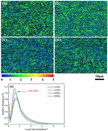 KAM in corresponding parameters. (a) ATR1, (b) ATR3, (c) DPR1, (d) DPR3, (e) the relative frequency of local misorientation, the rainbow legend bar shows the corresponding angle zone of KAM map.