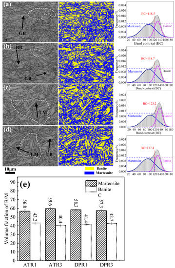 The distribution of bainite and martensite based on the EBSD data. (a) ATR1, (b) ATR3, (c) DPR1, (d) DPR3, (e) the volume fraction of B/M and the band contrast map (BC) on the left, phase map in the middle, and frequency distribution fitting graph (Gaussian) of BC on the right.