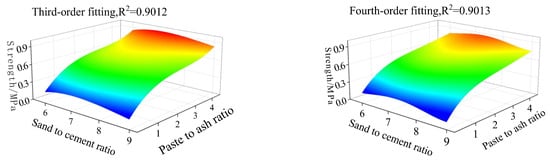- Sensitivity analyses conducted using the methods of polar difference analysis and variance analysis revealed that the sand to cement ratio, paste to ash ratio, and maintenance days had the greatest influence on density, while the paste to ash ratio, maintenance days, and sand to cement ratio had the greatest influence on strength. Single-factor analysis indicated that sand to cement ratio was negatively correlated with both strength and density, while paste to ash ratio was positively correlated with both. Maintenance days were found to be positively correlated with strength and negatively correlated with density. Based on our findings, we suggest that the reasonable range of maintenance days is between 5–10 days. Furthermore, we derived a higher order fitting equation for the effect of sand to cement ratio and paste to ash ratio on strength, determining that the third-order fitting equation could be used to guide the proportion selection of physical simulation experiments in the Shendong coalfield.