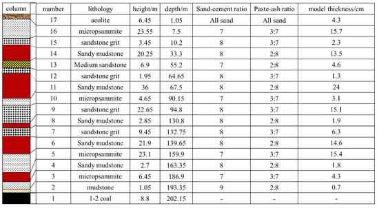 - Zhang, X.Y.; Luo, L.; Xu, L.F.; Zhao, M. Research on quantitative determination method of similar materials ratio. Saf. Coal Mines 2019, 50, 45–48 + 53. [Google Scholar]