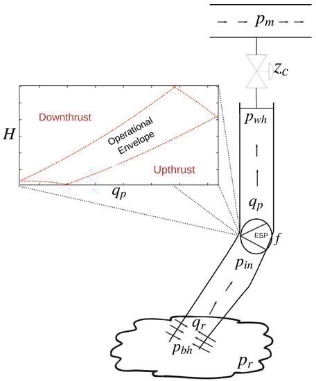 Figure 1 depicts a typical ESP-lifted oil-well system. The ESP operates by adjusting the rotational frequency of the pump, f, and the production choke valve opening, , to apply additional pressure to the oil and bring it to the surface through the production column and manifold. The fluid properties, such as flow type, the average flow rate in the production column, , and ESP head dynamics, H, defines the operational envelope constraint, which consists of time-varying up-thrust and down-thrust constraints. A typical operational envelope curve is shown in Figure 1, usually available from pump manufacturer datasheets. In this study, the average flow rate of the production column was treated as a measured variable. At each sample interval, the maximum head value, , and minimum head value, , were established for the current value on the operational envelope curve.