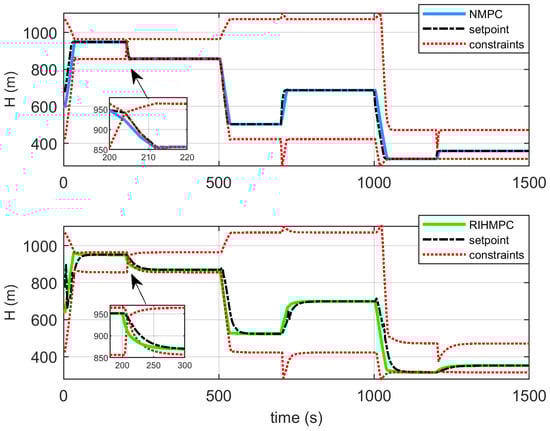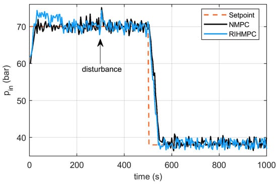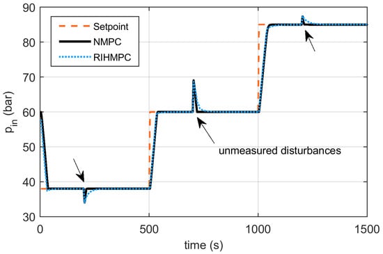Figure 13 shows the intake pressure dynamics obtained by the controllers in the noisy scenario, where a considerable difference in performance was noted in the transitory period of the first setpoint change. Both NMPC and RIHMPC controllers stabilized the plant, but the NMPC was faster at driving the intake pressure to the desired setpoint with a transient of approximately 24 s, while the RIHMPC took around 140 s. This can be easily explained by the fact that the NMPC encompassed a nonlinear model that captured the plant dynamics very well. In contrast, the most probable RIHMPC model () is suitable for high-gain regions, and the activation of the economic target forced the controller to operate the plant with a low gain (large valve opening choke), as shown in Figure 14. However, it can be emphasized that this deliberate choice was intended to show that the controller remains stable within the multi-model-based uncertainty description.