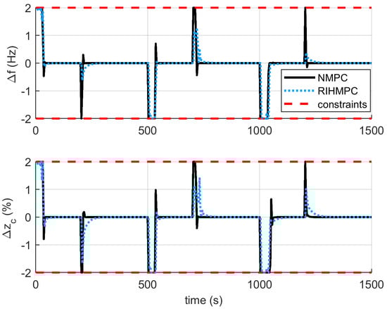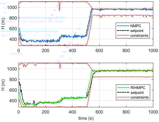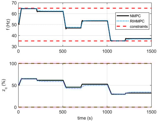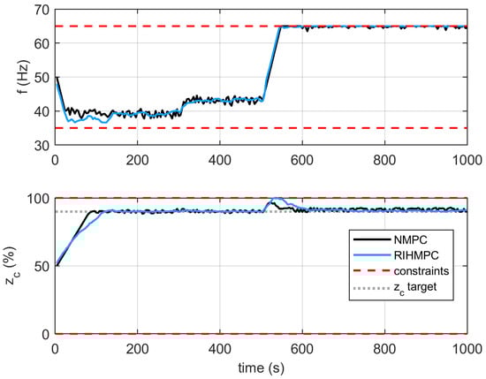 Figure 4 shows the performance of the NMPC and RIHMPC controllers in the assigned task. Similar dynamic responses were observed during transient periods, and both controllers met the expected requirements related to intake pressure tracking and disturbance compensation.
