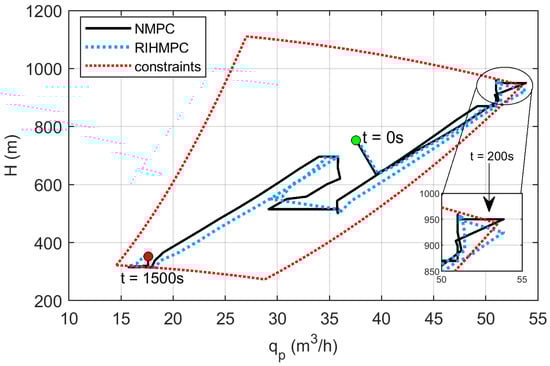 Trajectories over the ESP operational envelope for the NMPC and RIHMPC controllers.