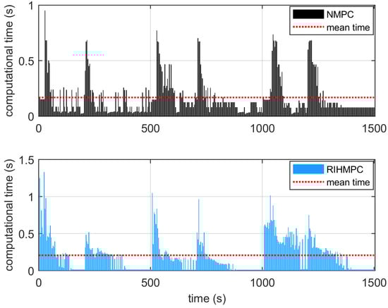 Figure 17 shows the computational times obtained on the Teensy 4.1 hardware in this scenario. The NMPC had an average time of 0.4798 s and a maximum time of 0.6658 s throughout this simulation, while the RIHMPC performed an average time of 0.5243 s and a maximum time of 1.5848 s. In this respect, both met the real-time operation requirements with a sampling time of 4 s. Special attention must be given to the RIHMPC controller during transients because it reached the maximum registered value to comply with the predefined tolerances. This analysis was crucial to know if the computational performance of the hardware was compatible with the sampling intervals of the application. To verify the reliability of the results and that the embedded controllers presented repetitive behavior, a total of 10 simulations were performed with the same scenario, obtaining the mean () and standard deviation () of the average and maximum computational times of both controllers, which are shown in Table 4.
