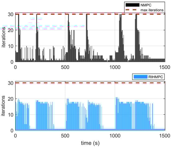 The computational time performed throughout the HiL simulation by both control strategies on the host hardware Teensy 4.1 is shown in Figure 10. This is one validation to assess whether the controllers can operate in real time or if they need to be redesigned. The NMPC had an average time of 0.1680 s and a maximum time of 0.9505 s throughout this simulation, while the RIHMPC performed an average time of 0.2080 s and a maximum time of 1.3304 s. Naturally, the moments of more significant computational burden occurred during transient periods, in which the SQP solver performed more iterations to converge the NMPC and RIHMPC optimization problems, as shown in Figure 11. This indicates that both projected control laws met the real-time operation requirements with the ESP system, whose sampling time was 4 s. To demonstrate the repeatability of these results, a total of 10 simulations were performed with the same scenario, obtaining the mean () and standard deviation () of the average and maximum computational times of both controllers, which are shown in Table 2.