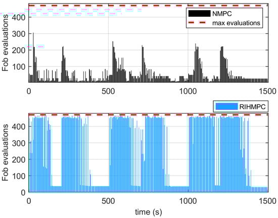 Figure 11 shows the number of iterations that the SQP solver performed to converge the NMPC and RIHMPC optimization problems. Only NMPC reached the maximum iteration limit during the transitory period. However, as shown in Figure 12, its number of objective function evaluations was smaller than the ones needed for the RIHMPC. From this result, it is clear that the RIHMPC control law required a computational effort slightly greater than the NMPC to be solved. This was also confirmed by the data in Table 2, in which the average and maximum times were greater for the RIHMPC.