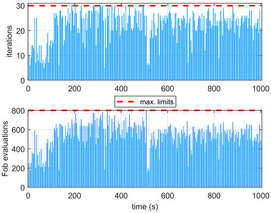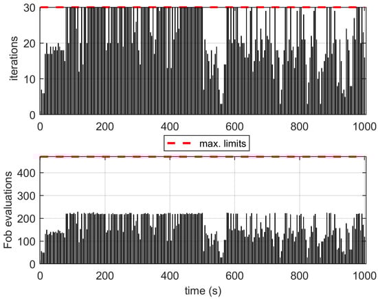 Finally, Figure 18 and Figure 19 show the performance of the SQP solver to converge the optimization problems focusing on the number of iterations and objective function evaluations of the NMPC and RIHMPC, respectively. These were the main factors related to the computational times shown in Figure 17. To solve the NMPC control law, the limits of 30 iterations and 470 objective function evaluations were enough without infeasibility. Similarly, to solve the RIHMPC control law, the limit of 30 iterations was also sufficient. However, increasing the limit of objective function evaluations to 800 turned out to be necessary to avoid infeasibility. Thus, naturally, the computational times recorded in this scenario were greater than those recorded in the previous scenario, but they safely met the real-time requirements of the application.
