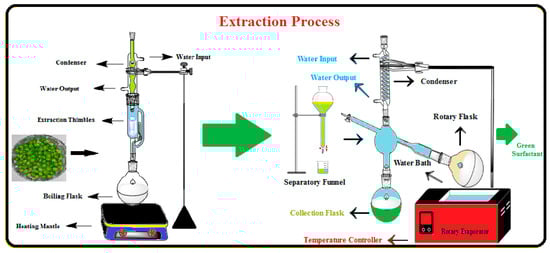 The Soxhlet extraction method was employed to extract the high-purity saponin compound as the surfactant agent from the Pisum sativum. Figure 2 provides the schematics of procedures used for saponin extraction. In this step, 100 g of the fine PS powder was prepared and poured into the Soxhlet’s thimble, where it was mixed with 500 mL of methanol at 60 °C for about 12 h. Afterward, the methanol was separated using a rotary evaporator, and the left-over compound was mixed with 50 cc of DIW. The solution was mixed with 50 cc of n-butanol in a separatory funnel. After proper agitation, the solution changed into two immiscible organic (top phase) and aqueous (bottom phase) layers. Diethyl ether was added to the collected organic components, and the mixture was centrifuged for 20 min at 3500 rpm. Finally, the pure saponin was collected as the brown precipitated compound and used for EOR applications. The experimental results showed that the saponin yield as the natural surfactant in this study was 8.1%, which is comparable to the reported data in the literature [26,30,31].