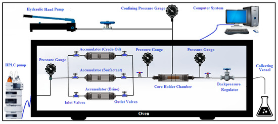 The setup for the core flooding tests used in this research (Fars EOR Tech Co., Iran) is demonstrated in Figure 6. The carbonate cores were cleaned and washed with acetone and toluene, then dried at 70 °C overnight. Each sample was then saturated with FB in a saturator vessel for 24 h at a confining pressure of 3500 psi. After placing the saturated core sample into the core holder, 5 PVs of FB were injected into the sample, followed by the injection of 5 PVs of crude oil at a confining pressure of 4500 psi and a temperature of 80 °C. Following this step, the sample was removed from the core holder and kept at 80 °C for around 30 days within a glass jar filled with crude oil to achieve a state of equilibrium between the carbonate rock, FB, and crude oil. In the next step, 5 PVs of FB were injected into the core sample to perform the secondary recovery after putting the core sample into the core holder. Finally, the tertiary recovery was performed by injecting 5 PVs of the smart solution into the core at a confining pressure of 4500 psia and a reservoir temperature of 80 °C. For the tertiary recovery, two different solutions were prepared. The first solution included 1500 ppm of PS green surfactant in 12,500 ppm of FB, while the second contained 1500 ppm of PS green surfactant in 150,000 ppm of FB. The amount of produced oil was measured during secondary and tertiary recoveries, and the oil recovery factor was measured accordingly.
