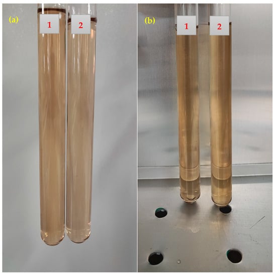 Compatibility tests of different solutions after 30 days: (a) solutions at 30 °C; (b) solutions at 80 °C (1: 1500 ppm of PS green surfactant in 12,500 ppm of FB; 2: 1500 ppm of PS green surfactant in 150,000 ppm of FB).