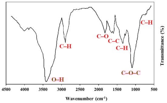 The FT-IR analysis of the isolated PS green surfactant is shown in Figure 8. As illustrated, the major peaks of green surfactant are detected. The O–H stretching of the hydroxyl group in the PS green surfactant causes the peak at 3447 cm−1. The major peak at 2925 cm−1 is due to the C–H stretching of the aromatic compounds present in the PS green surfactant. The peaks at 1643 cm−1 and 1608 cm−1 are attributable to the C–C bond. The peak at 1371 cm−1 presents the C–H vibration. The peak at 1067 cm−1 presents the C–O–C vibration of the ester group, and the peak at 731 cm−1 shows the C–Br stretching. The results of the FT-IR analysis of PS green surfactant are aligned with findings presented in several previous investigations [26,27,28,29,30,31].