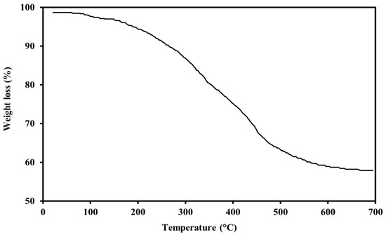 Figure 9 indicates the TGA test results for the PS green surfactant’s thermal stability. The weight loss of the sample is around 1.73% at a reservoir temperature of 80 °C, demonstrating the extremely high thermal stability of the PS surfactant. In addition, further increasing the temperature to about 600 °C resulted in 36.74% weight loss. The weight loss of the PS surfactant at temperatures of up to around 175 °C is usually due to the evaporation of moisture and surface water. The weight loss at temperatures of 175 to 600 °C is generally due to the breakdown of glycosidic bonds and intermolecular hydrogen bonds. The TGA analysis result for the PS surfactant is on par with other green surfactants reported in the scientific literature [27,28,29,31,32].